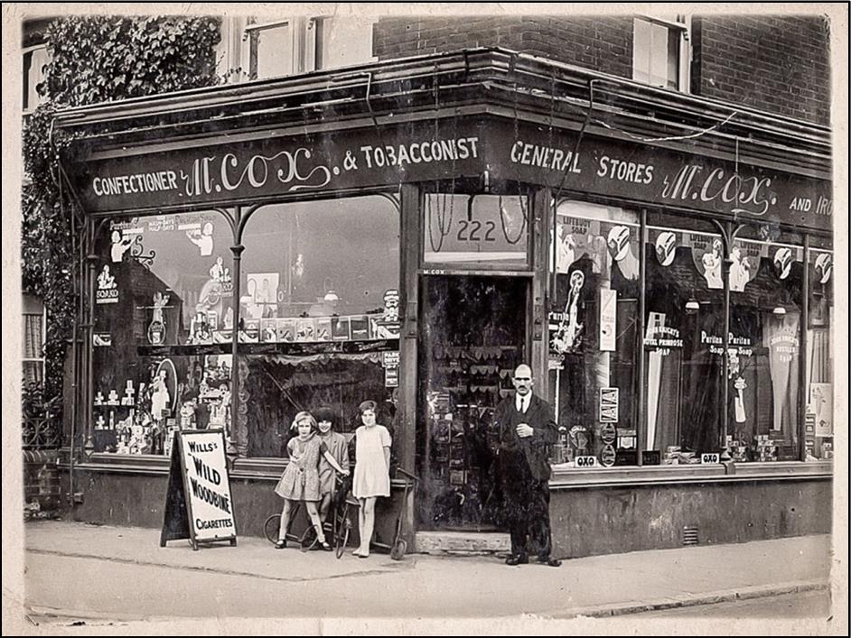 Her father, John Henry Cox, is standing by the door. Perhaps unusually for the time, the shop was in her mother’s name: