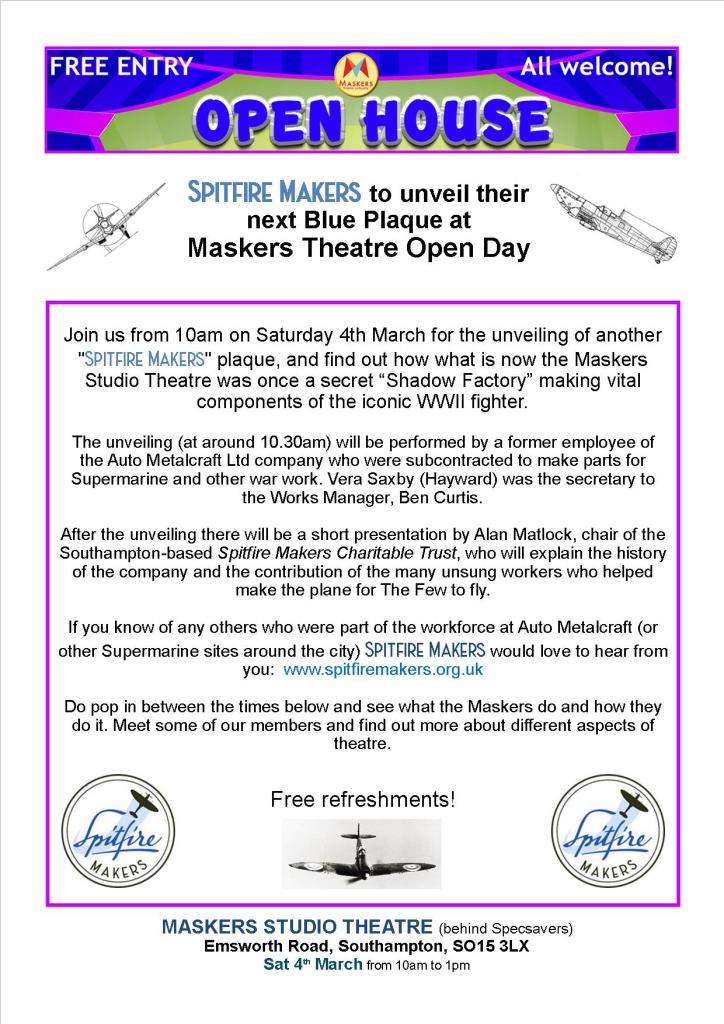 - Spitfire Makers to unveil their next Blue Plaque at Maskers Theatre Open Day