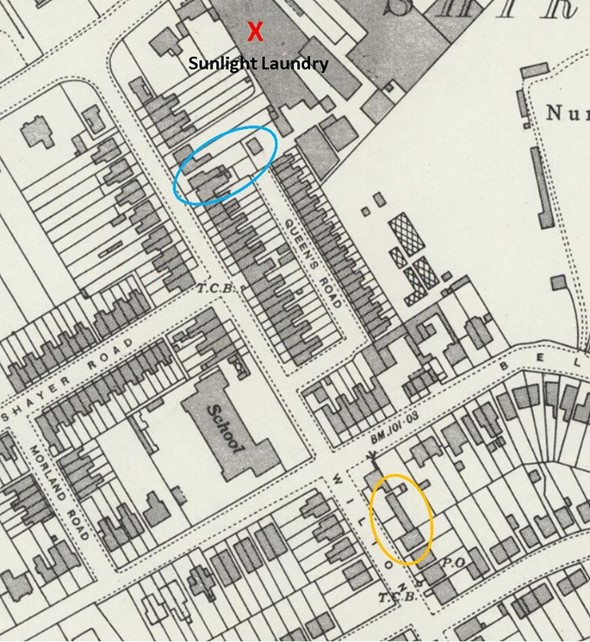 The house at 16, Wilton Rd does back onto the site of the Sunlight Laundry ( X in red) and one structure is shown there (circled in blue) on the 1946 map.