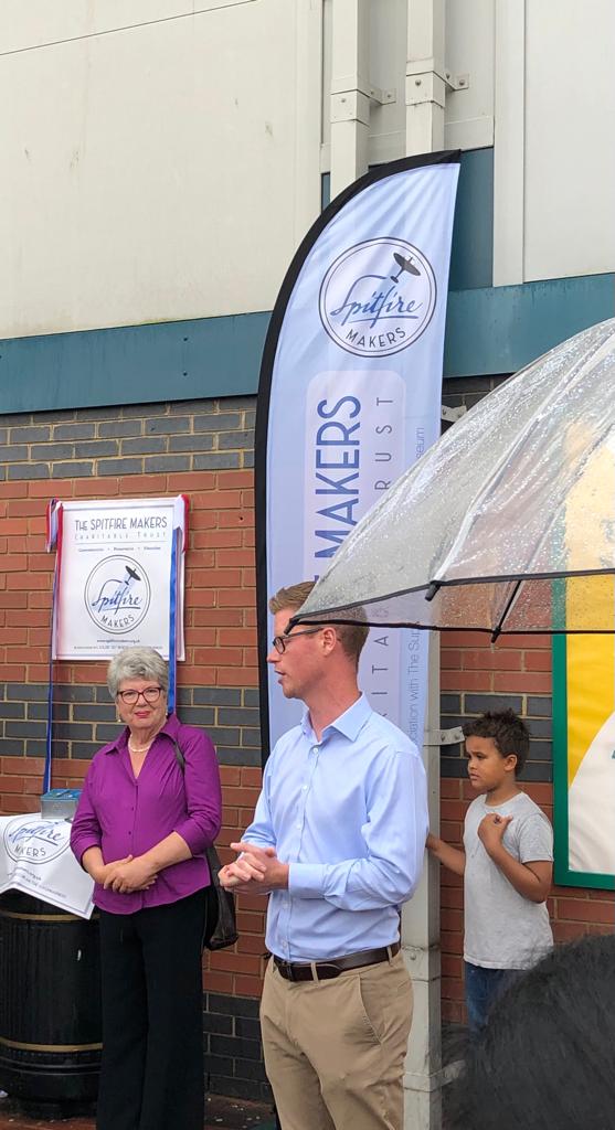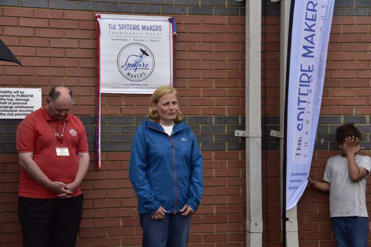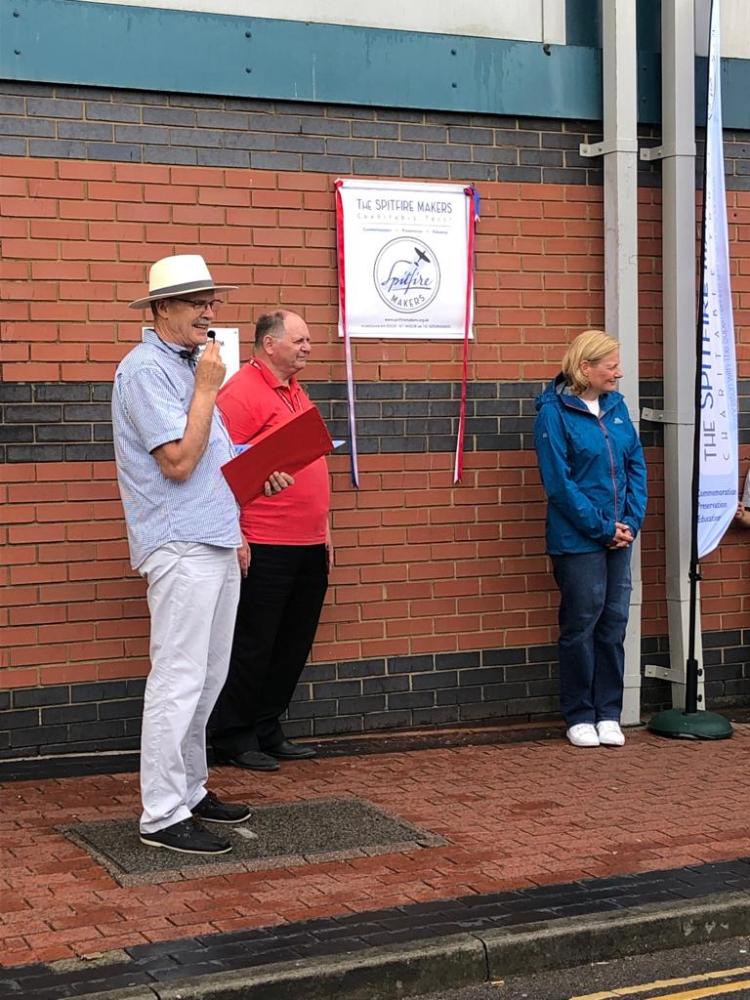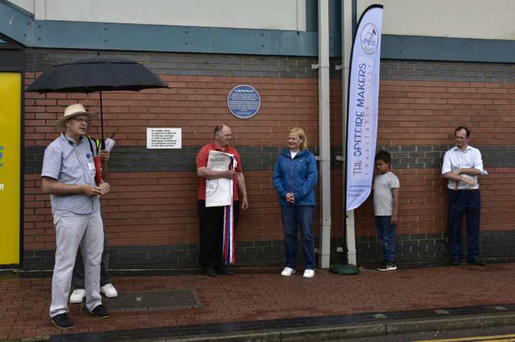 The plaque outside Pure Gym was unveiled by David Hutchings, chair of the S&DTHT and the patron of Spitfire Makers, Sqn Ldr Mandy Singleton (RAF retired), who was until recently the Senior Engineering Officer of the Battle of Britain Memorial Flight.