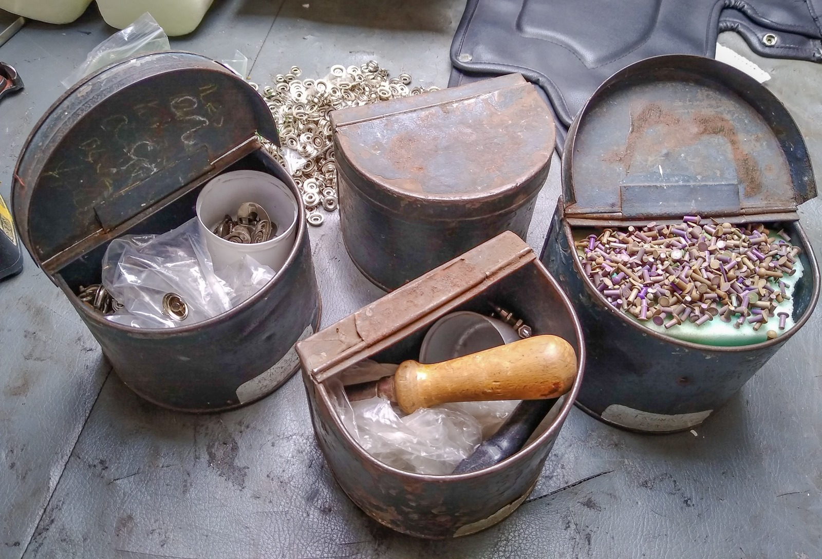Here are the tins now: still being put to good use by Mike at Wessex Car Trimming. He was told that the tins had been used to keep Spitfire rivets in so I took along my own multi-coloured collection to see if they would feel at home. There was no clear labelling on the tins other than some possible, very faint, painted lettering.