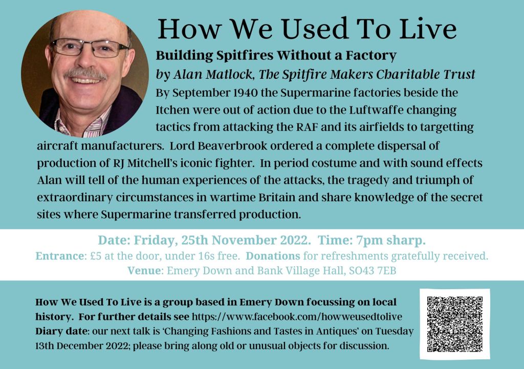 If you’d like to know, come to a New Forest focused version of the full “Building Spitfires Without a Factory” talk at Emery Down and Bank Village Hall on Friday 25th November at 7pm or get in touch to book Alan for your group.