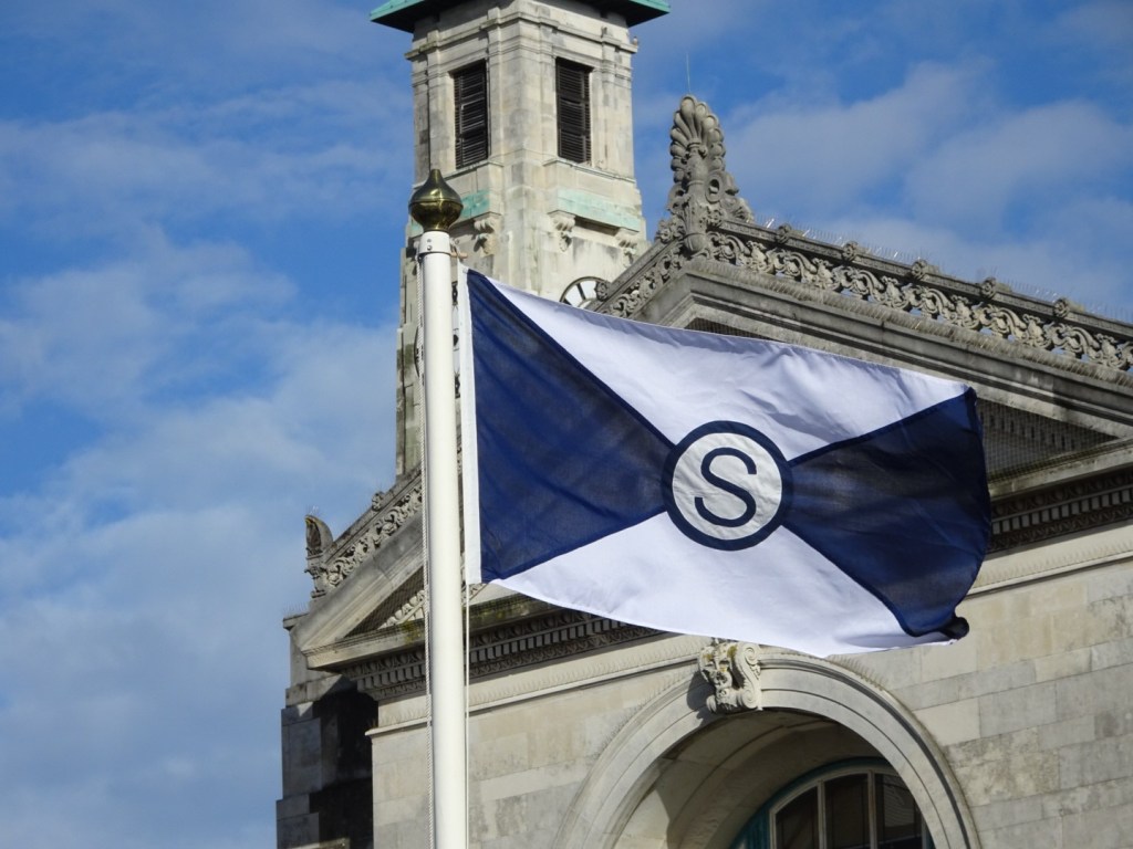 The Supermarine flag flying outside of the Civic Centre from 24th to 26th September 2020 as a tribute to the people of Southampton in 1940.