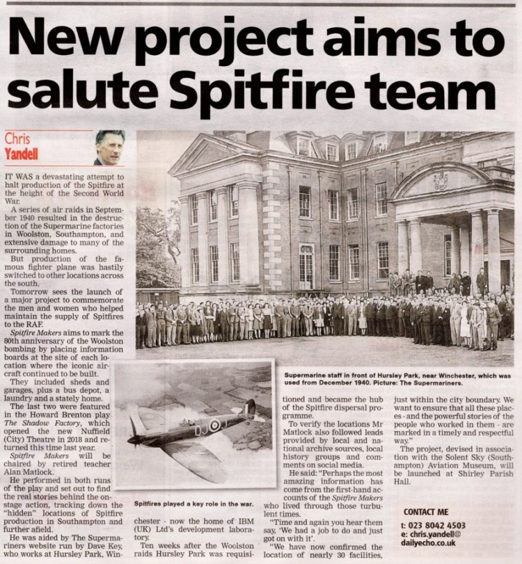 the Shirley Local History Group set up an annual series of public talks which have proved to be very popular and have continued every autumn in the Shirley Parish Hall, which was identified by Don Smith as a former secret Spitfire production site. Alan Matlock’s talk in the autumn of 2019 broke record audience numbers and received a very positive response. At the talk, a member of the audience asked why the ‘hidden’ locations that Alan shared with them were not currently recognised in any form and so, the seeds of an idea for the Spitfire Makers Memorial plaques were sown. Since then Alan has been joined by a small group of like-minded enthusiasts including guides from Solent Sky Museum and local historians, who want to ensure this heritage is preserved and commemorated. The project was launched to a capacity audience on 23rd February 2020 in the Shirley Parish Hall with the aim being to recognise the many women, girls, men and boys who worked in the dispersal factories through a series of plaques to be located on the site of each “Shadow Factory”.