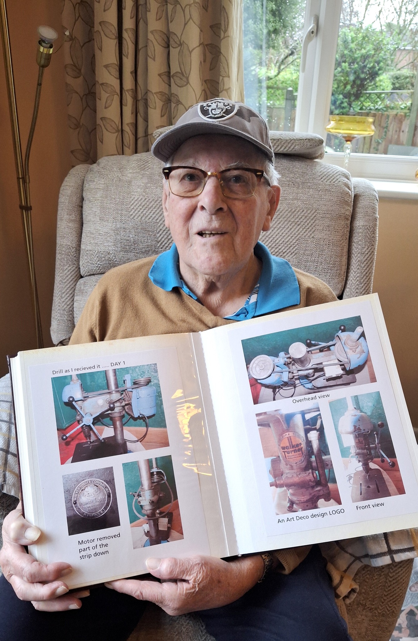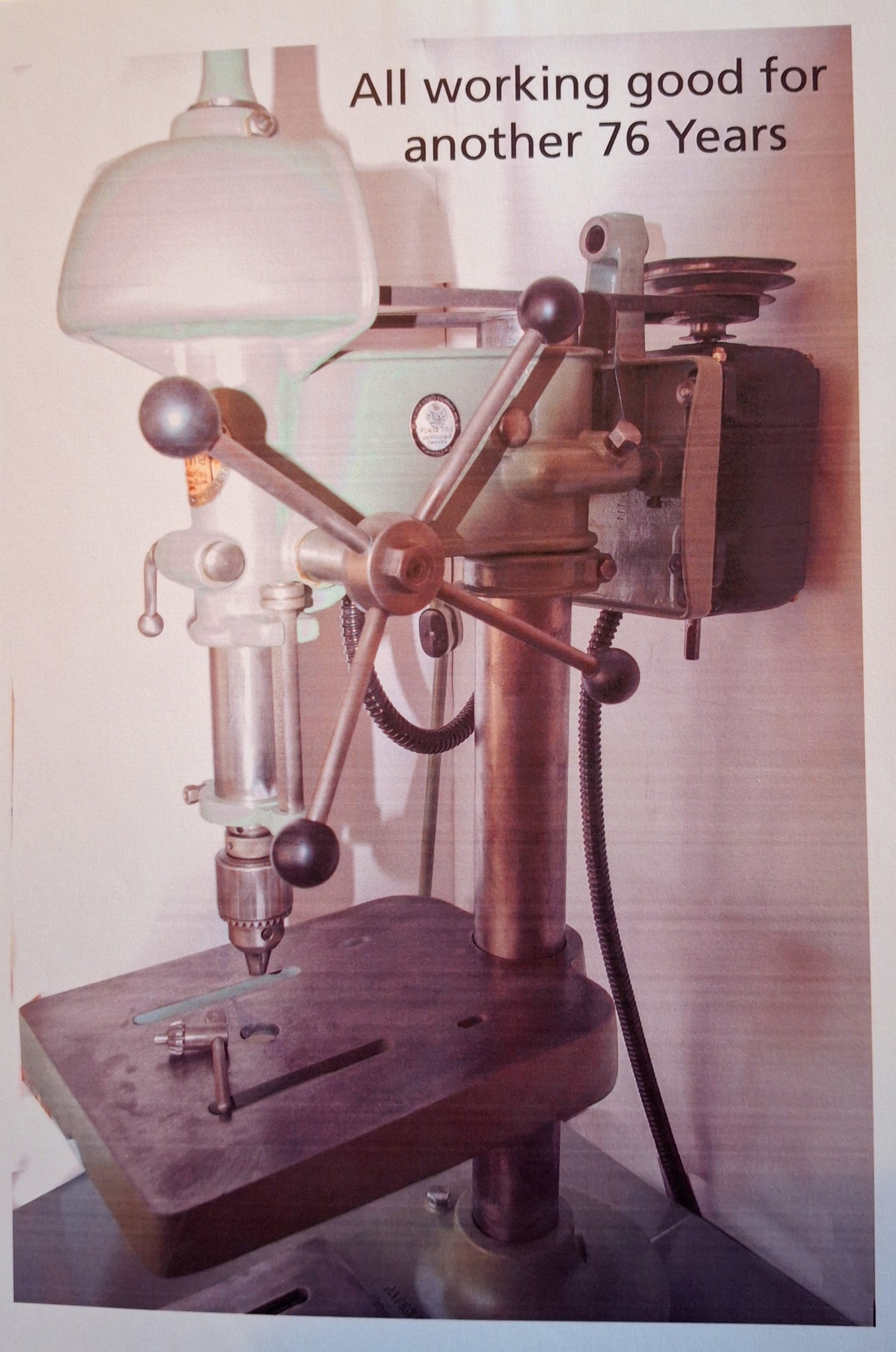 I visited a very lively 90+ year old George Childs today as he had got in touch to say he had some photos, in an album left to him by his brother John, which showed a pillar drill with an “MAP” (Ministry of Aircraft Production) badge and “AST / 5” punched onto it.