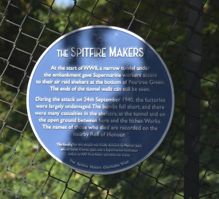 The plaque at the tunnel site that led to the workers’ air raid shelters was unveiled by Mervyn Jupe. Mervyn’s father, Charles George Jupe, was a 19-year-old Supermarine apprentice and first aider who attended the scene of the bombing but was told there was nothing he could do. Assisting him was Marlene Beveridge, whose mother and father survived, but a family cousin, 19-year-old Ronald Barfoot did not, and Amanda Strand – her father, Ivor Hughes survived but her grandfather John did not.