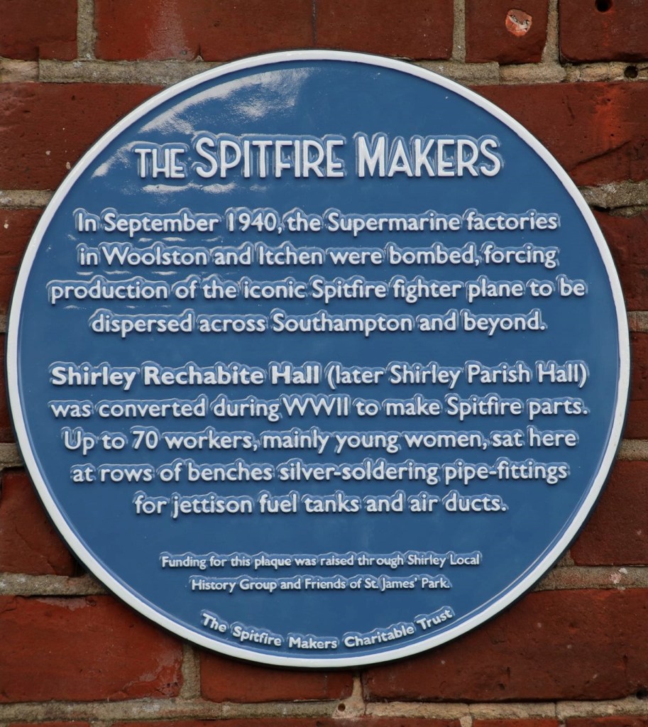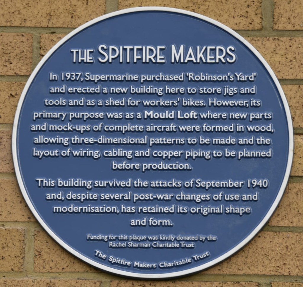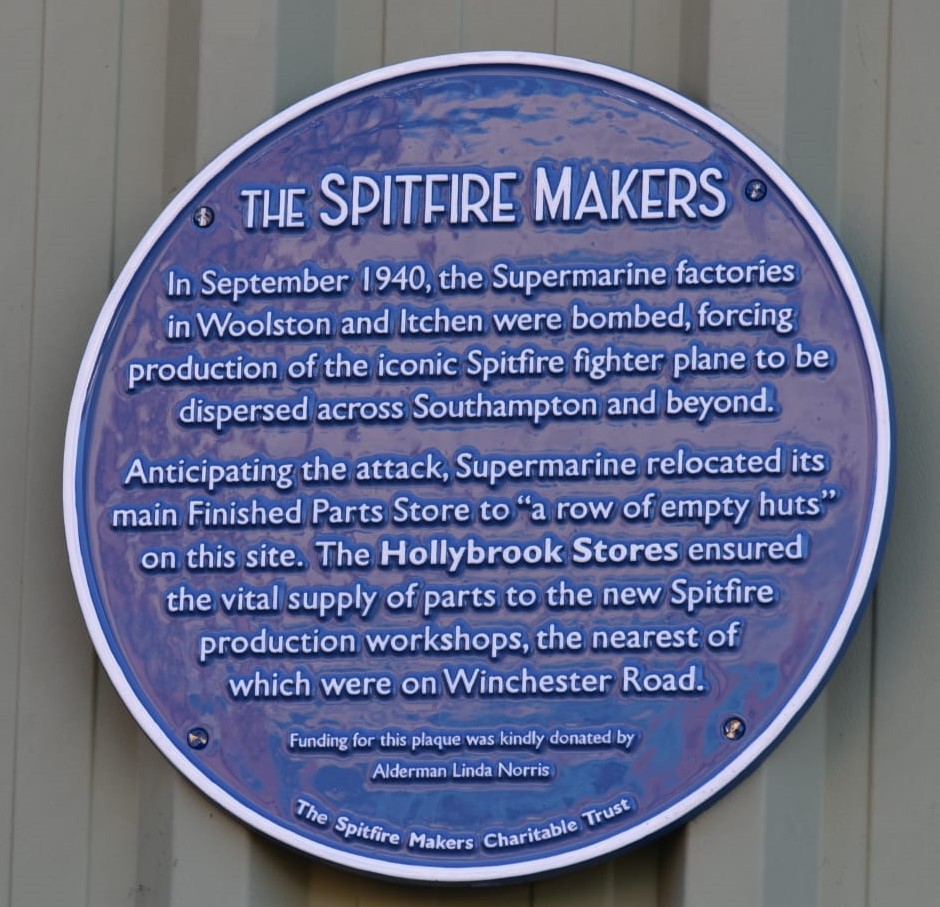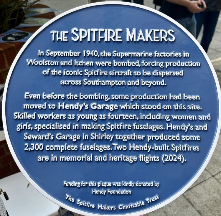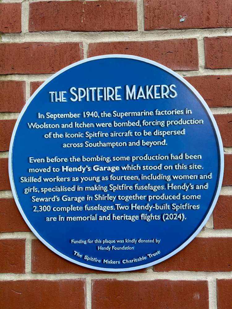 The Spitfire Makers blue plaque was unveiled on Sunday 6th June 2023, to commemorate the Sunlight Laundry which produced parts for the wings and fuselages, and can be seen close to the entrance to the Marks &Spencer Food Hall on Winchester Road, Shirley, Southampton.