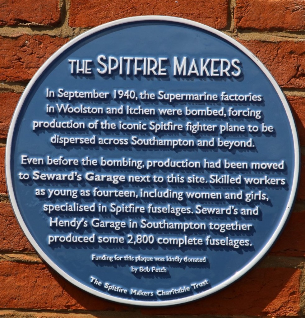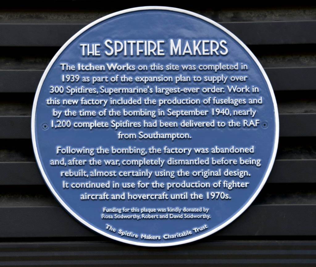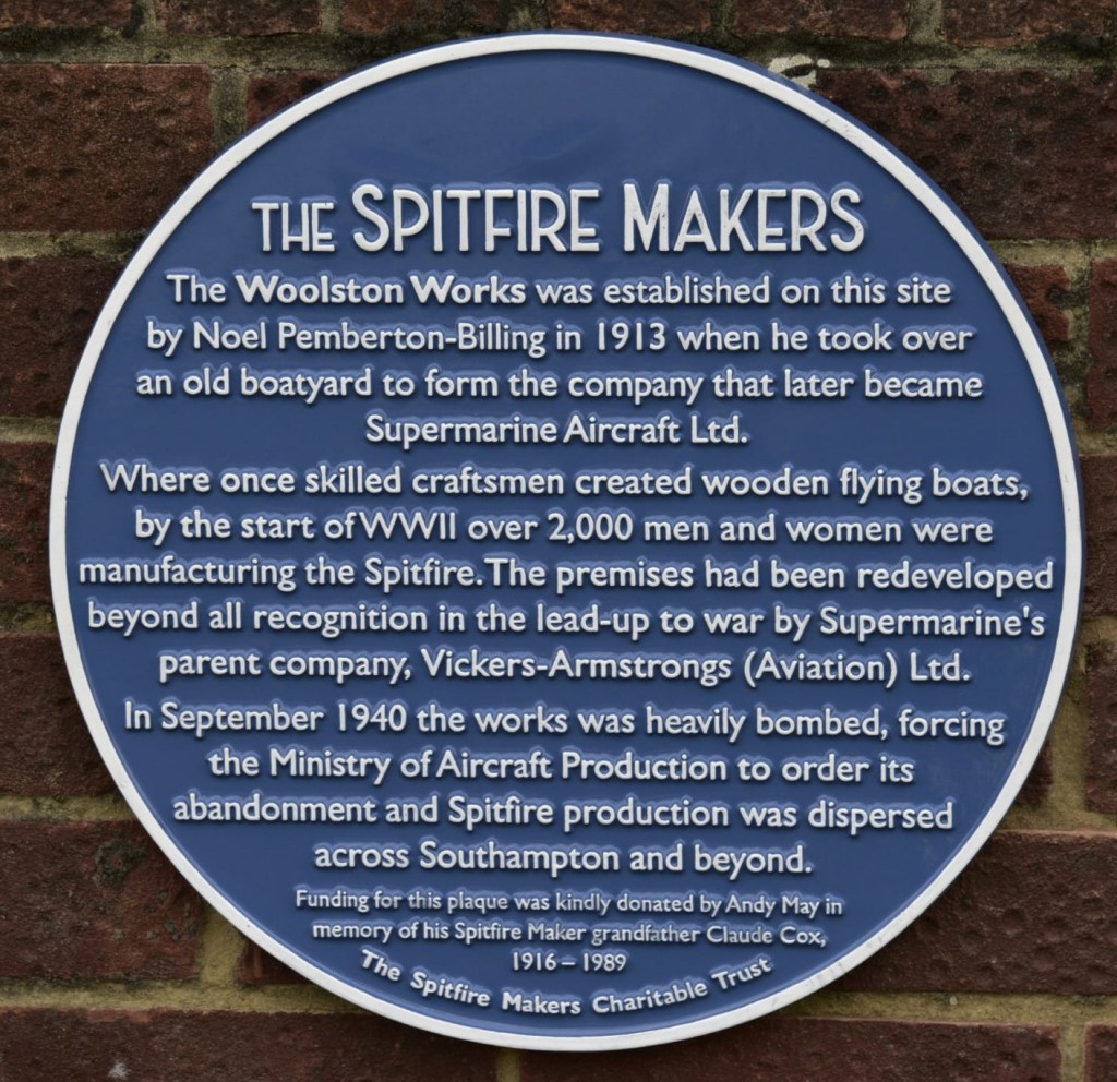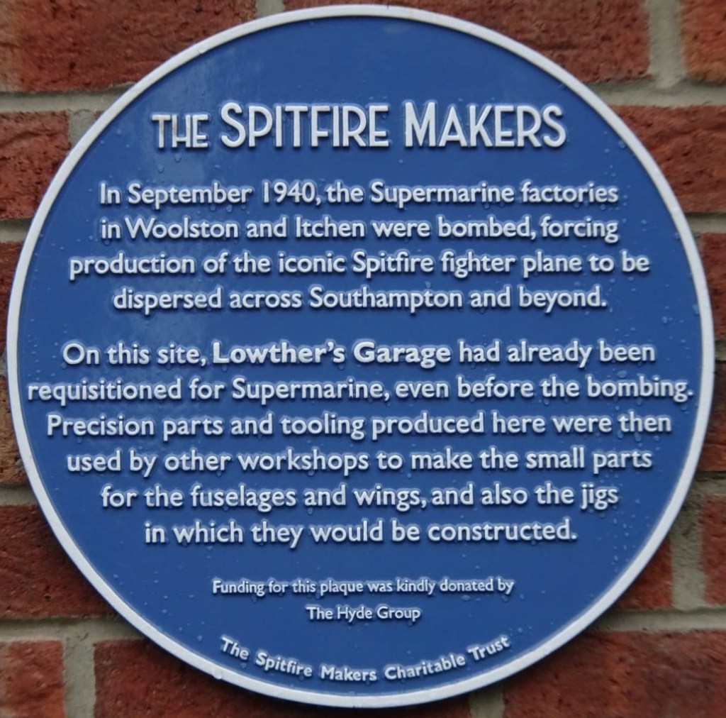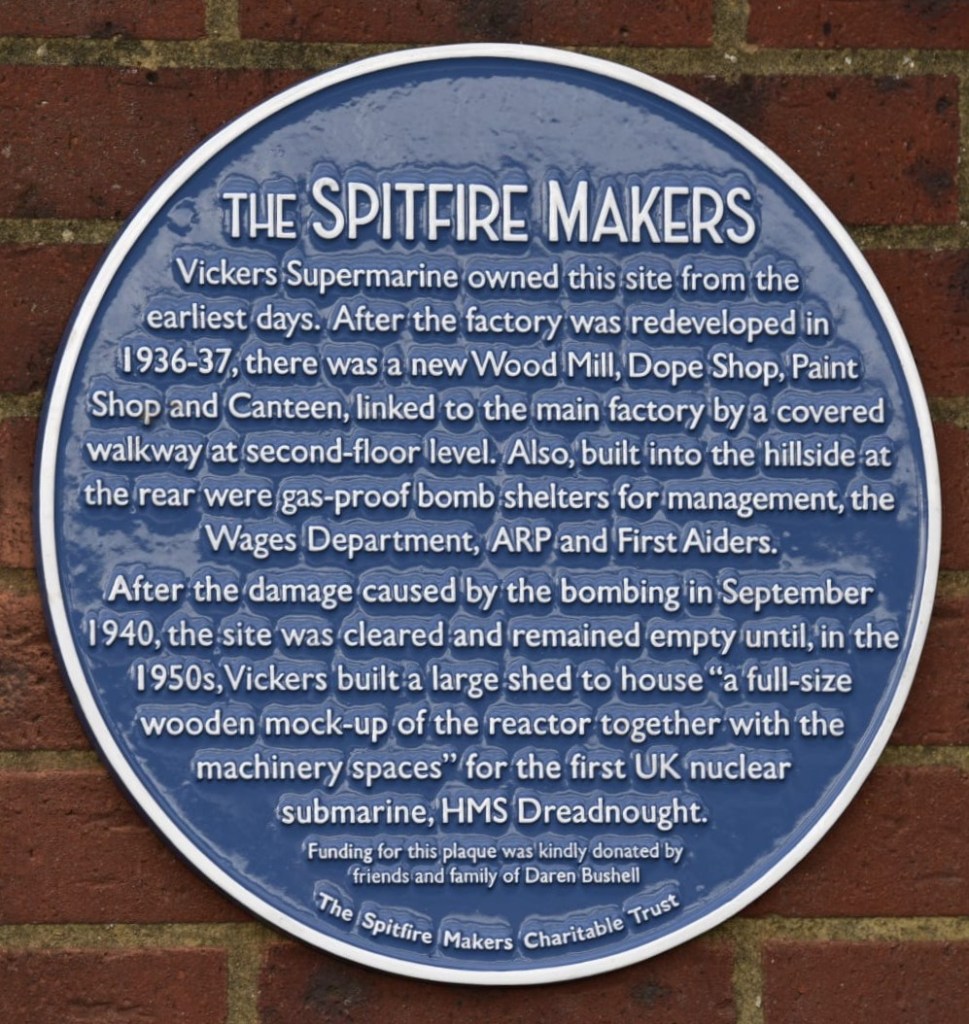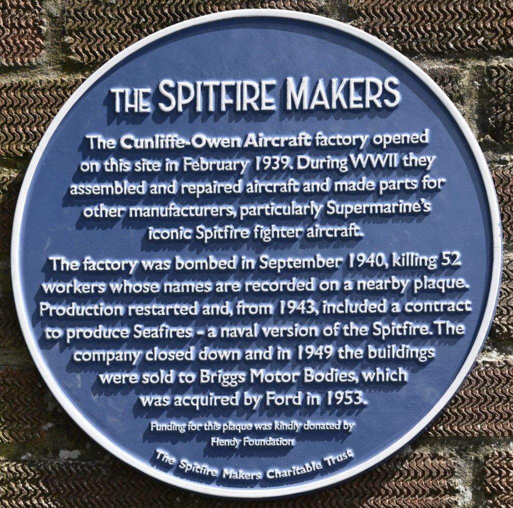 The plaque records the company’s contribution to Spitfire production and honours those whose worked, and died, in the factory. 52 workers were killed in a daylight bombing attack on September 11th, 1940, just two weeks before the Supermarine factories in Woolston were attacked.