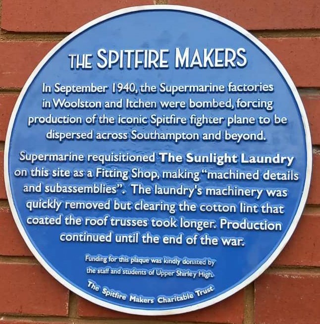 The Sunlight Laundry plaque outside M&S was sponsored by the students and staff of the Upper Shirley High School whose premises back onto what was the Laundry site. Research from the Spitfire Makers Charitable Trust project has been incorporated into the Year 9 history syllabus at the school.