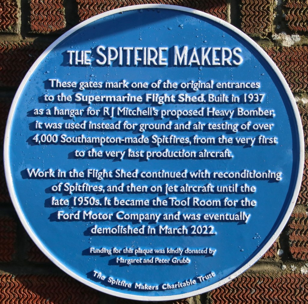 A nationally significant building, where all production models of the Spitfire were ground- and air-tested from 1937 until the late 40s, the Flight Shed was demolished and replaced by a modern industrial unit in 2022. The plaque stands on the right hand pillar of the old entrance gates which in 1939 also served as the way in to the Cunliffe Owen Aircraft Company. Their factory was taken over by Briggs Motor Bodies and ultimately Ford who built their Transit vans there.