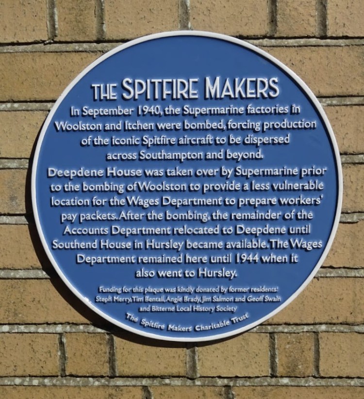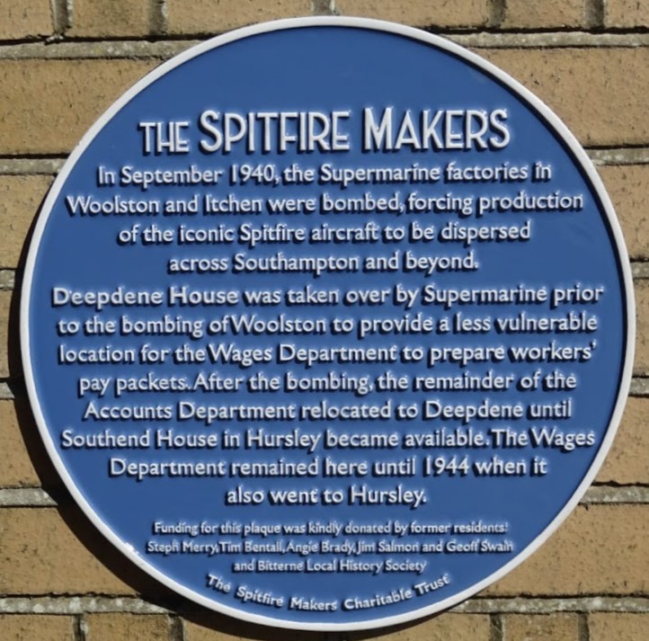 The plaque has been placed at the entrance to Deepdene House in Midanbury Lane, Bitterne. Taken over completely after the bombing of the factories in September 1940, the house was a safer location for the workers’ pay packets to be made up. Some of the wages department moved out to Hursley when Southend House became available there, but others remained at Deepdene.