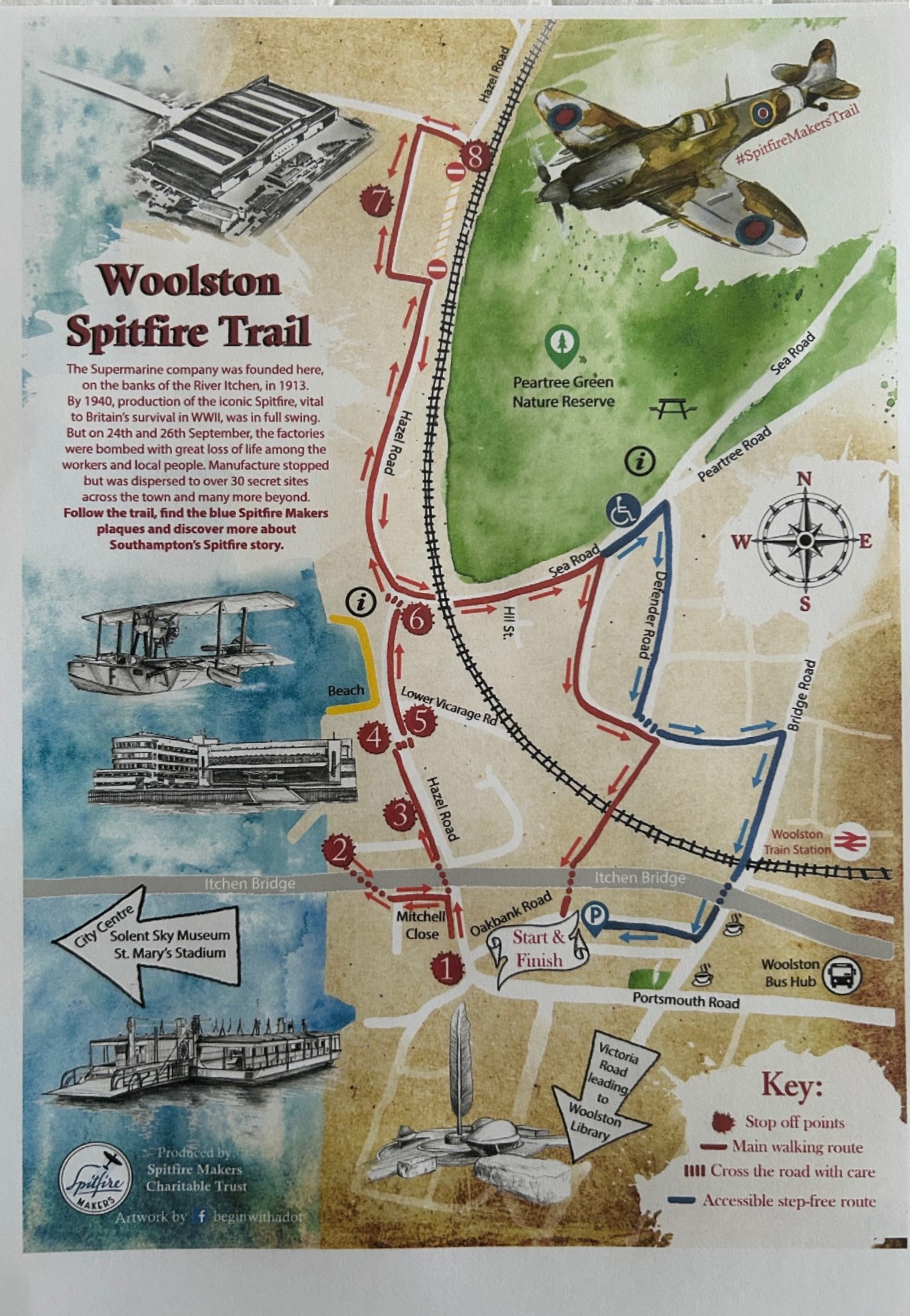 Due to the popularity of the Shirley Spitfire Trail Map, Spitfire Makers were pleased to have worked again with the artist Sarah Silver, to design a Woolston Spitfire Trail Map. The trail map was designed in response to requests from our supporters and the popularity of guided Spitfire walks in the Hazel Road area.