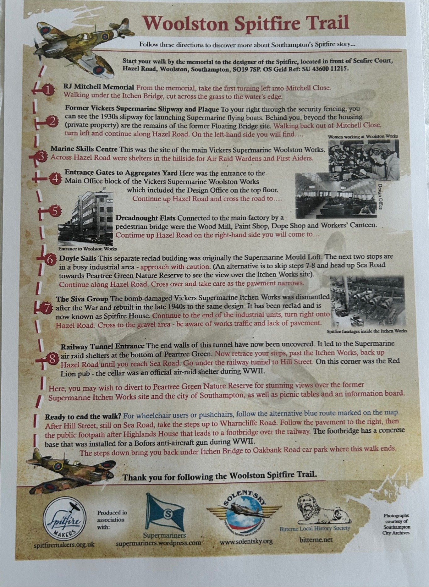 The trail provides people with a self-guided walk taking in the sites along Hazel Road, Woolston, Southampton where the Spitfire was designed and made prior to September 1940. The walk starts and finishes at the beginning of Hazel Road with adequate parking nearby.