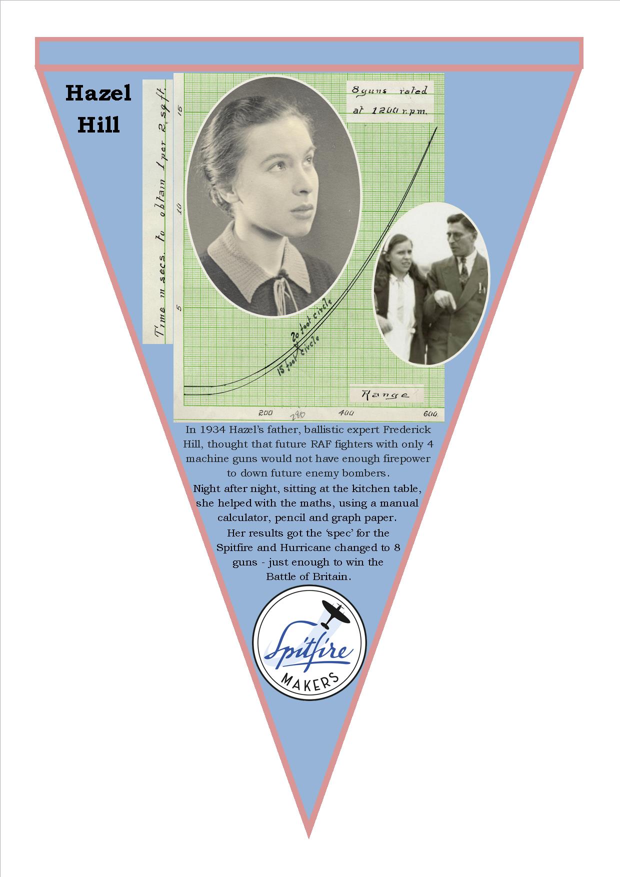 In 1934 Hazel’s father, ballistic expert Frederick Hill, thought that future RAF fighters with only 4 machine guns would not have enough firepower to down future enemy bombers. Night after night, sitting at the kitchen table, she helped with the maths, using a manual calculator, pencil and graph paper. Her results got the ‘spec’ for the Spitfire and Hurricane changed to 8 guns – just enough to win the Battle of Britain.