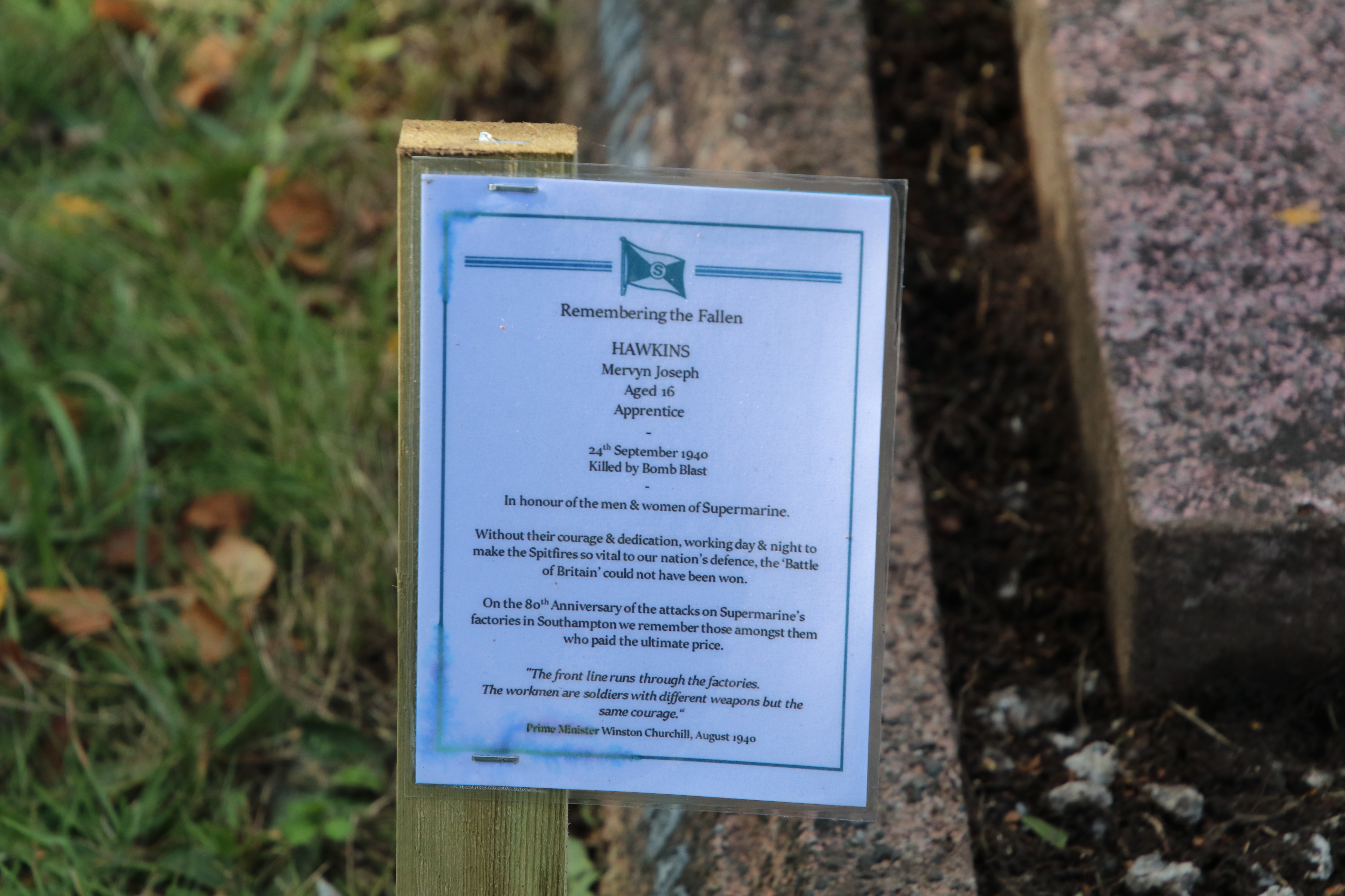 Joe was an apprentice at Supermarine. He was 16 years of age when he was killed in the bombing raid on the 24th September 1940. Joe is buried in Hollybrook Cemetery, Southampton.