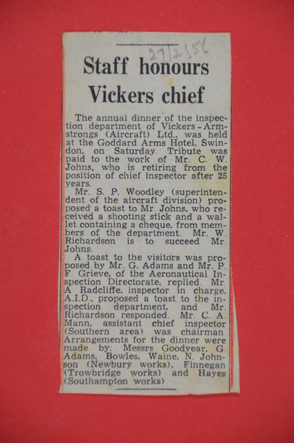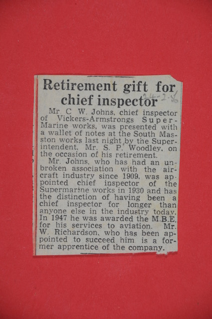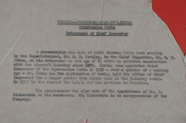 Having signed the Official Secrets Act my father said absolutely nothing about his work, so I knew nothing about it. In around 2009 we took him to the Aviation Museum at Duxford. He’d been having an animated conversation with one of the stewards who obviously knew a lot about the Spitfire that they were looking at. I said “So tell me about this plane – you must know something about it!” “Oh, yes, I worked on re-designing the tail on that one as the nose went down when they fitted the new Griffon engine into it.” That’s still all I know! He did know R J Mitchell but owing to Mr Mitchell’s untimely death he was far more familiar with his successor as Head of the Drawing Office, Joe Smith. He also knew the test pilots Alec Henshaw and Geoffrey Quill.